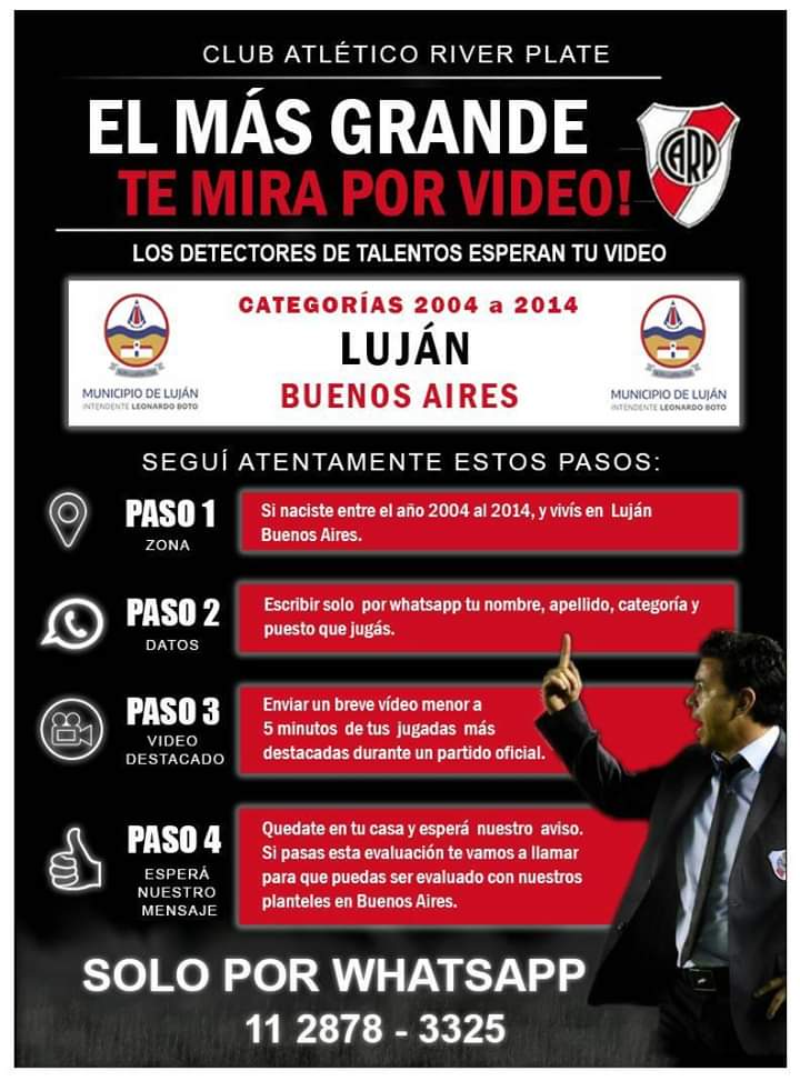 Sin embargo, mientras eso es cuestión de debate, los grandes equipos siguen diagramando su futuro intentando no cambiar sus costumbres aunque sí los modos. Es así como el Club Atlético River Plate continúa en su afán de captar futuras promesas, aunque ahora no mediante la presencia de entrenadores en una práctica sino utilizando la tecnología. Es así que con el auspicio de la Dirección de Deportes de la Municipalidad de Luján, circula por distintas redes sociales una convocatoria del elenco Millonario.