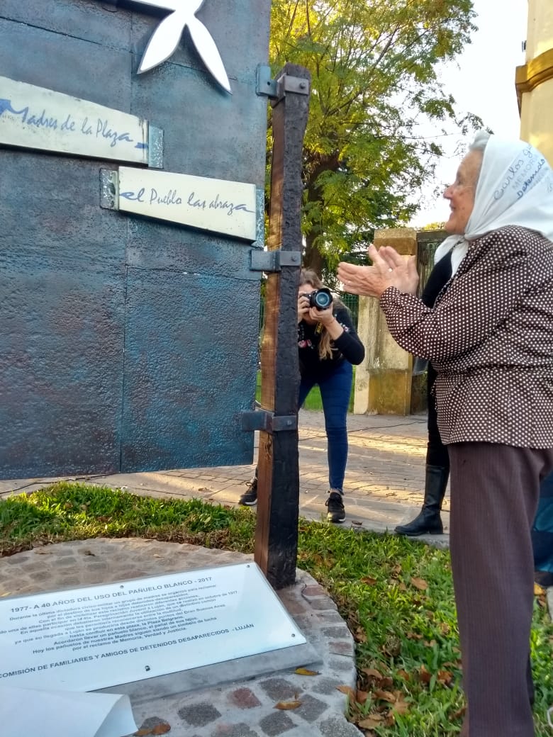 El monumento a las Madres de Plaza de Mayo, situado en la plaza Belgrano, quedó inaugurado este domingo en Luján. Tras meses de arduo trabajo, retratado en una muestra de fotos de Victoria Nordenstahl y Beatriz Grafia, la escultura simboliza la lucha y resistencia en el reclamo por la desaparición de los hijos. El monumento tiene dos quebrachos que representan a las dos madres de Luján, Ana Aguirre y Rosa Palazzo. El proyecto fue iniciativa del periodista de El Civismo, Nicolás Grande, quien llevó la propuesta a la Comisión de Familiares y Amigos de Detenidos Desaparecidos de Luján, como forma de recordar a las madres al cumplirse 40 años en 2017 del uso del pañuelo blanco. Y fue en esta ciudad, en el marco de la 4° peregrinación juvenil, que se dio este hecho. Presente en el acto de inauguración del monumento, Nora Cortiñas, referente de Madres de Plaza de Mayo Línea Fundadora contó la experiencia que vivieron las madres aquel año de 1977 cuando vinieron a pie a Luján.