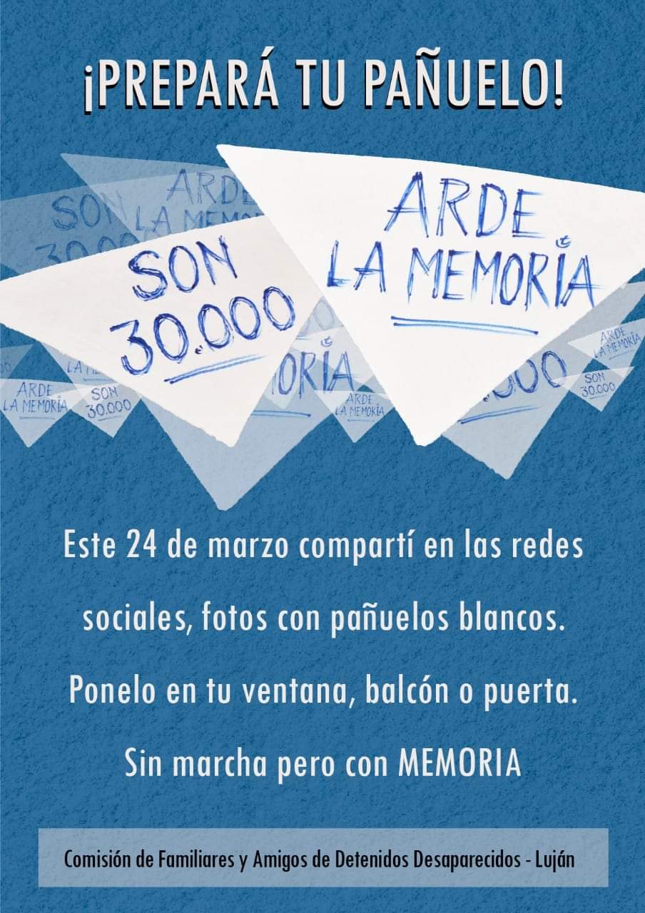 “El 24 de marzo compartí en redes sociales fotos con pañuelos blancos. Ponelo en tu balcón, puerta o ventana. Sin marcha, pero con memoria”, dice la convocatoria de los organismos que organizan el “pañuelazo”. En las redes sociales, se propone utilizar las etiquetas #PañuelosConMemoria #24M #44AñosDelGolpe #Son30000 #MemoriaVerdadYJusticia, entre otros.