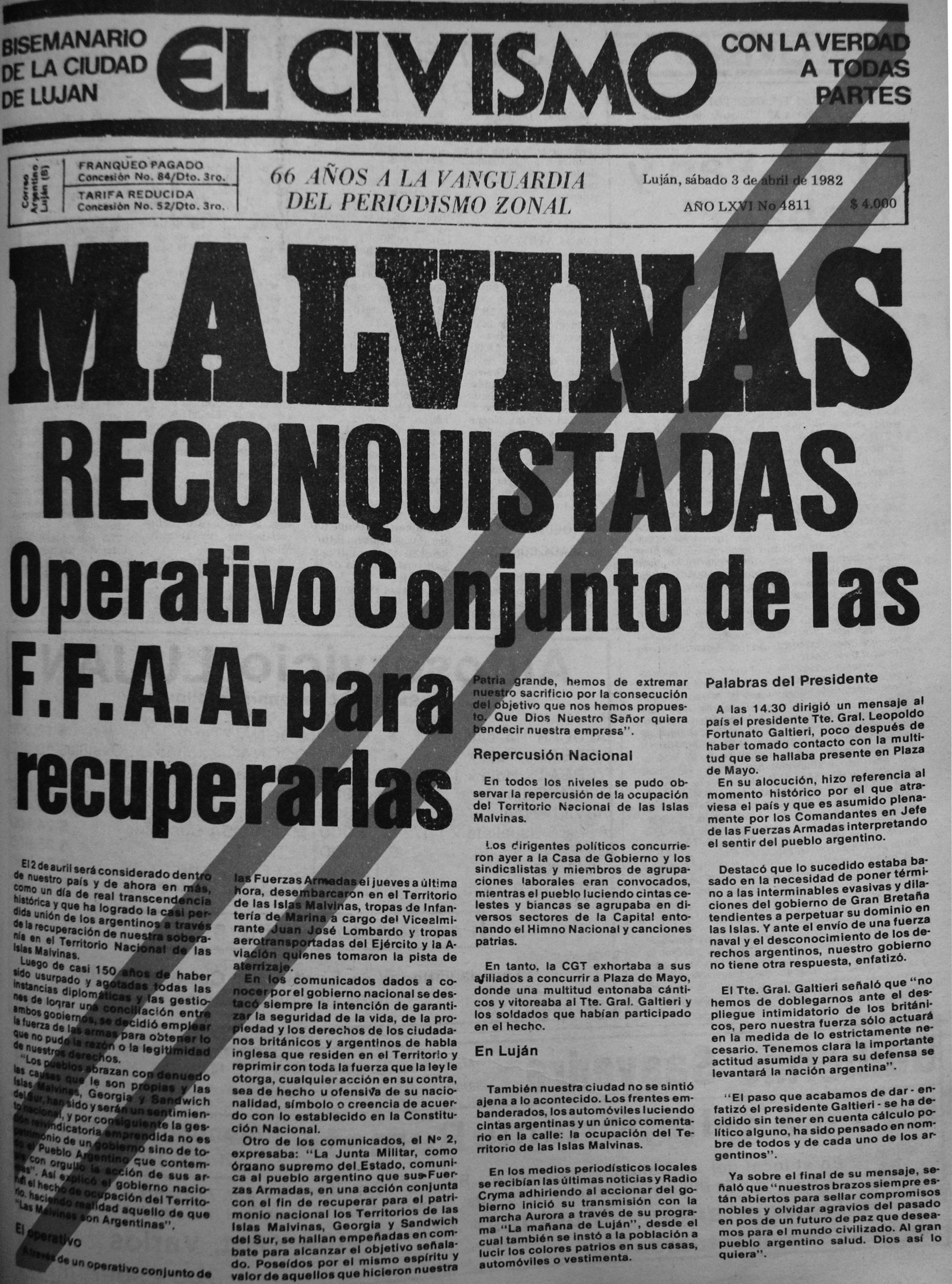 Con un título a página completa, EL CIVISMO anunciaba al día siguiente la “reconquista” y expresaba que “el 2 de abril será considerado dentro de nuestro país y de ahora en más, como un día de real trascendencia histórica y que ha logrado la casi perdida unión de los argentinos a través de la recuperación de nuestra soberanía en el Territorio Nacional de las Islas Malvinas”.