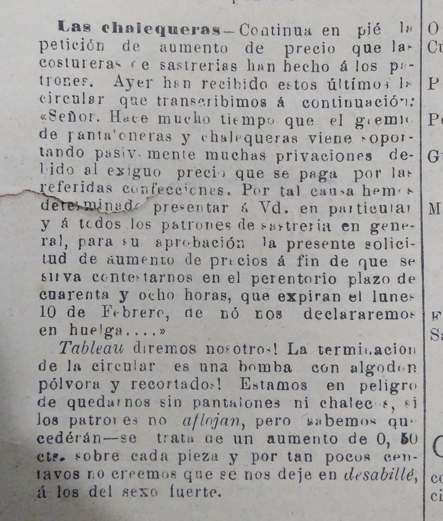 Pocos días después, chalequeras y pantaloneras difundieron un manifiesto dirigido a los patrones: “Hace mucho tiempo que el gremio de pantaloneras y chalequeras viene soportando pasivamente muchas privaciones debido al exiguo precio que se paga por las referidas confecciones. Por tal causa hemos determinado presentar a Vd. en particular y a todos los patrones de sastrería en general, para su aprobación la presente solicitud de aumento de precios a fin de que se sirva contestarnos en el perentorio plazo de cuarenta y ocho horas, que expiran el lunes 10 de febrero. De lo contrario nos declaramos en huelga”.