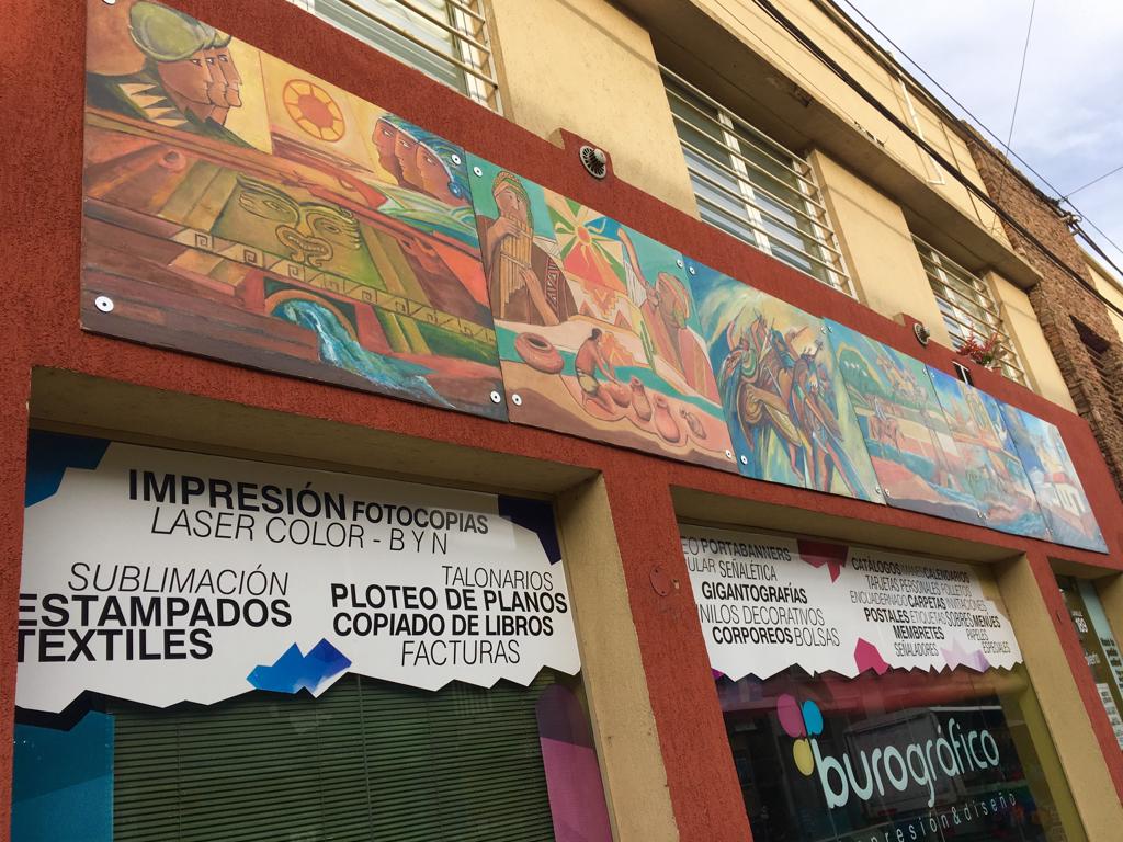 La artista plástica María Luisa San Miguel pintó un mural en el casco histórico de la ciudad. La obra, llamada Raíces, está ubicada en Lavalle 189, casi esquina Francia.
