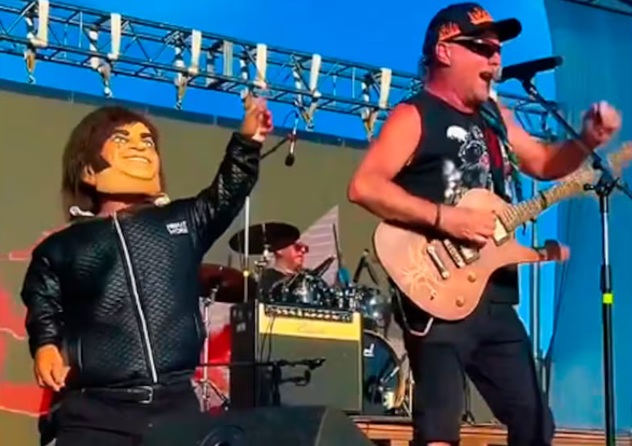 Mientras la banda interpretaba su popular tema, un hombre de baja talla disfrazado de Javier Milei (con una máscara que imitaba el rostro del Presidente) apareció sobre el escenario.