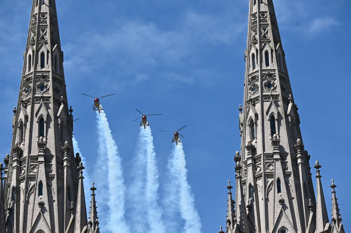 Participaron seis helicópteros Eurocopter EC-120 Colibrí, que realizaron maniobras de alta precisión y desplegaron humo con los colores de la bandera argentina, en una demostración aérea de gran destreza.