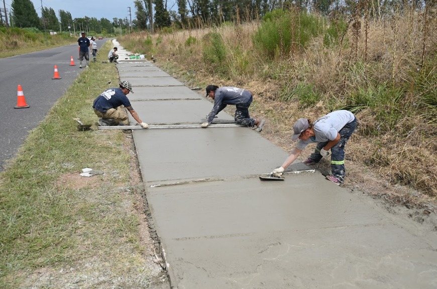 El proyecto continúa a la altura del paso a nivel del ferrocarril. En primer lugar se realiza el mejoramiento de la base con tosca compactada, luego la colocación del film y malla metálica, y por último el hormigonado con un espesor de 10 centímetros, para realizar la terminación peinada con bordes alisados.