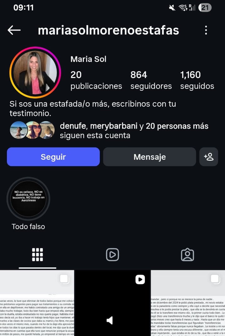 La cuenta, administrada de manera anónima, cuenta con casi 900 seguidores y ya reúne al menos 18 relatos distintos. En cada uno se repite un patrón: promesas incumplidas, transferencias presuntamente falsas, supuestas enfermedades graves utilizadas como argumento para pedir dinero y una identidad laboral vinculada a aerolíneas que, según quienes denuncian, no sería real.