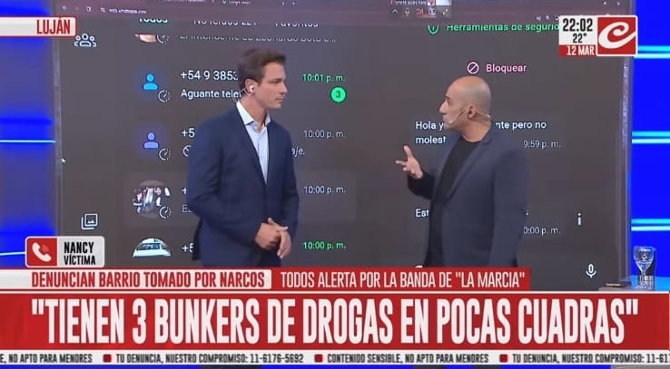 Debajo de las imágenes corría un graph con el texto: “Denuncian barrio tomado por narcos. Todos alerta por la banda de ‘La Marcia’. Tiene 3 bunkers de drogas en pocas cuadras”.